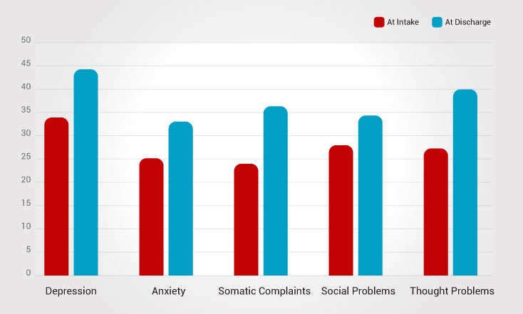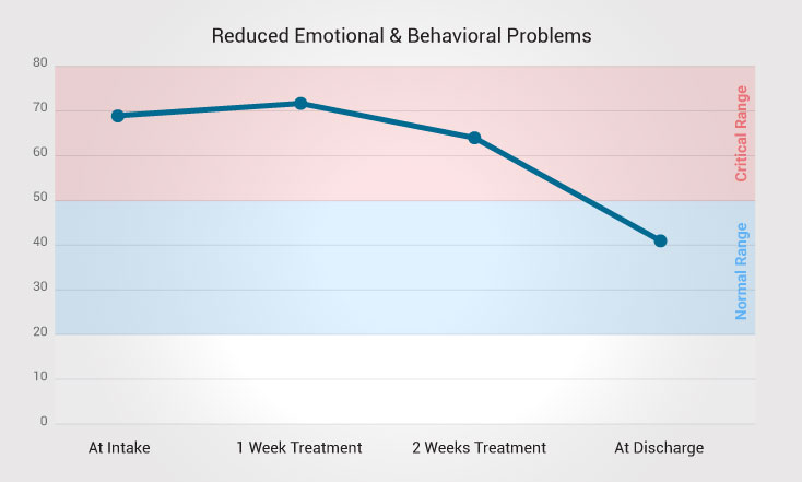 Parent and caregiver ratings showed substantial improvement in behavioral functioning from intake to discharge. This suggests a marked reduction in behavioral dysfunction over the course of treatment.