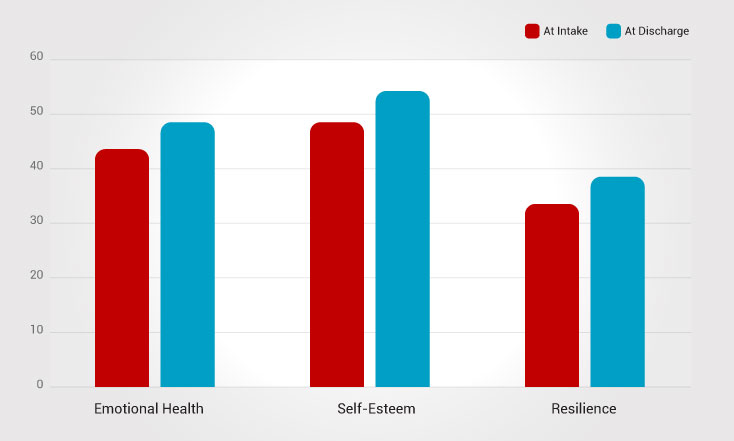 On a standard outcome questionnaire, youth move from a “clinical” level of dysfunction at intake to a “community” (normal) level of functioning by graduation.